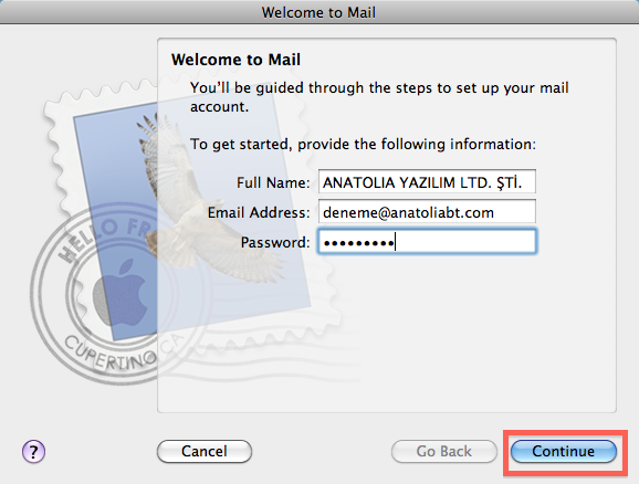 Aşağıdaki ekranı göreceksiniz. Bu ekranda FULL NAME (TAM İSİM) bölümüne bir isim yazın. Bu isim mail gönderdiğiniz zaman karşı tarafta görünecek olan isimdir. E-MAIL ADDRESS (E-POSTA ADRESİ) bölümüne mail adresinizi tam olarak yazın. (Örneğin deneme@anatoliabt.com) PASSWORD (ŞİFRE) bölümüne mail şifrenizi dikkatli şekilde girin. Şimdi CONTINUE (DEVAM) tuşuna basabilirsiniz.